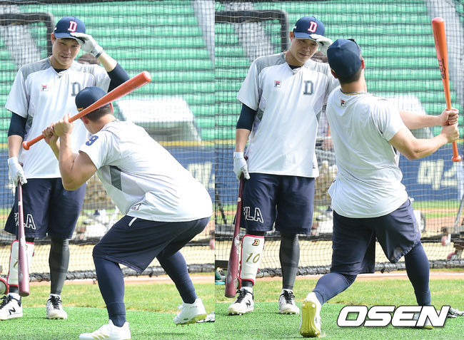 9일 오후 서울 잠실구장에서 열리는 '2017 타이어뱅크 KBO리그' 두산 베어스와 한화 이글스의 경기에 앞서 두산 민병헌이 박세혁에게 타격폼을 선보이고 있다. / youngrae@osen.co.kr