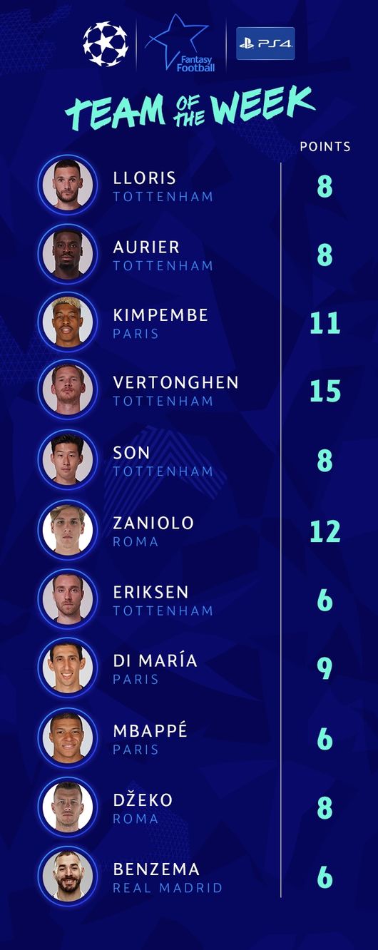손흥민은 미드필더 부문에 이름을 올렸다. 손흥민은 이날 열린 도르트문트와 경기서 후반 2분 팽팽한 영의 균형을 깼다. 베르통언의 크로스를 논스톱 발리로 마무리하며 천금 같은 선제 결승골을 터트렸다. 손흥민의 골로 분위기를 바꾼 토트넘은 베르통언과 요렌테의 연속골을 더해 안방에서 3-0 완승을 거둘 수 있었다.