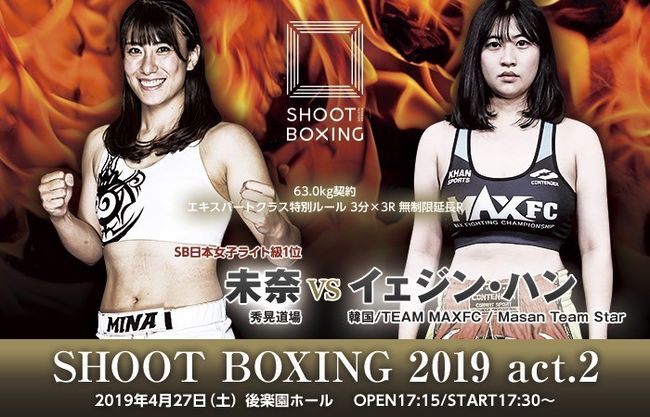 ‘강스타’ 강예진(23, 마산스타/MAX FC)이 한국의 자객 신분으로 일본 슛복싱 대회에 출전한다. 4 월 27 일 (토) 도쿄 코라쿠엔 홀에서 개최되는 "SHOOT BOXING 2019 act.2"에서 경기를 가진다. 상대는 슛복싱 여자 라이트급 1위 사쿠라이 미나(29, 일본)다.