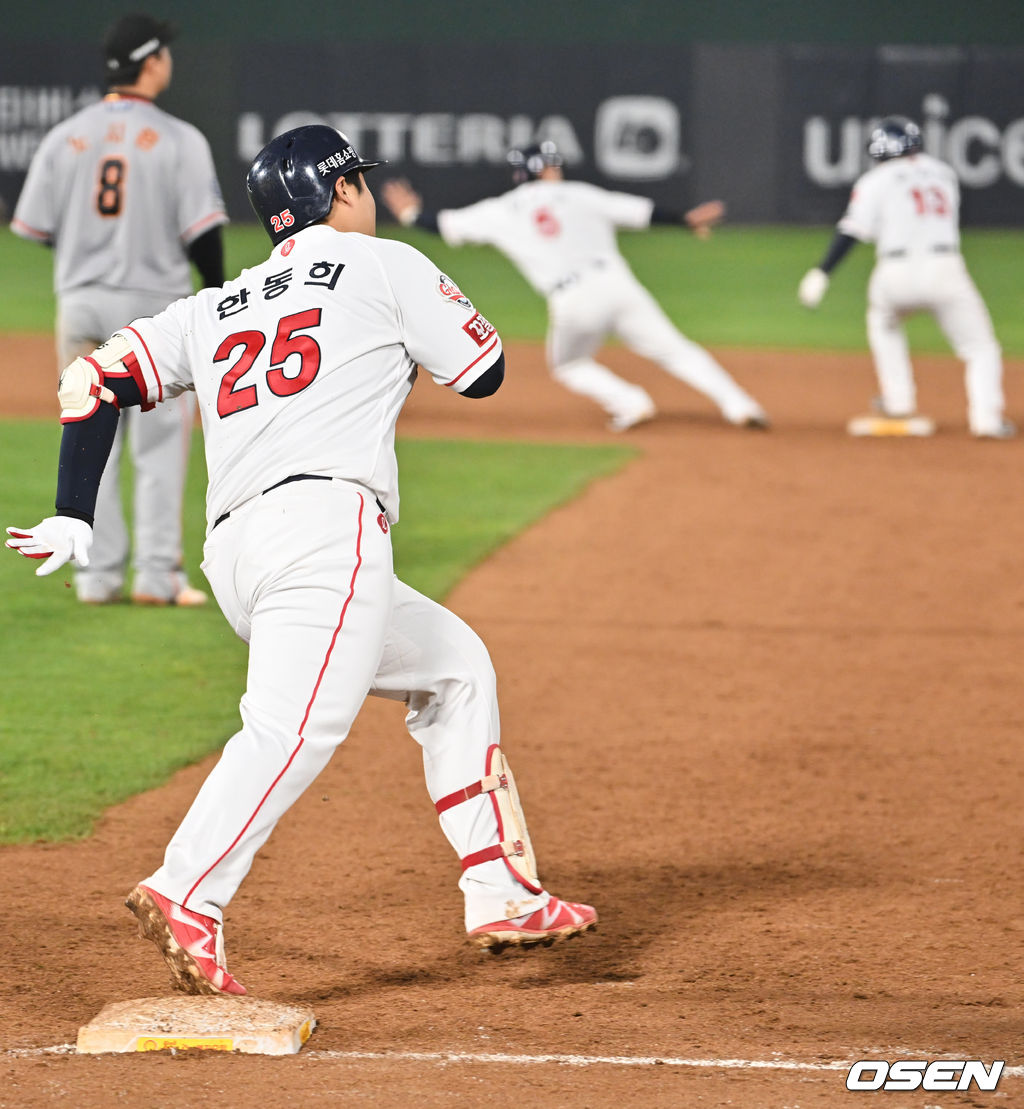 하지만 롯데는 계속된 1사 2,3루에서 이대호의 자동 고의4구로 만든 1사 만루 기회에서 피터스, 이학주가 모두 삼진을 당하며 추가점을 뽑지 못했다. 결국 주루 플레이 미스로 2점차로 달아 날 수 있었던 기회를 날려버린 롯데는 결국 8회초 터크먼의 동점 적시타, 김태연의 역전 희생플라이로 재역전 당하는 수모를 당하고 말았다. 만약 롯데 김민수가 3루를 돌아 홈으로 들어 왔다면 경기는 어떻게 됐을까? 롯데로서는 두고두고 아쉬움 남는 주루플레이였다. / foto0307@osen.co.kr