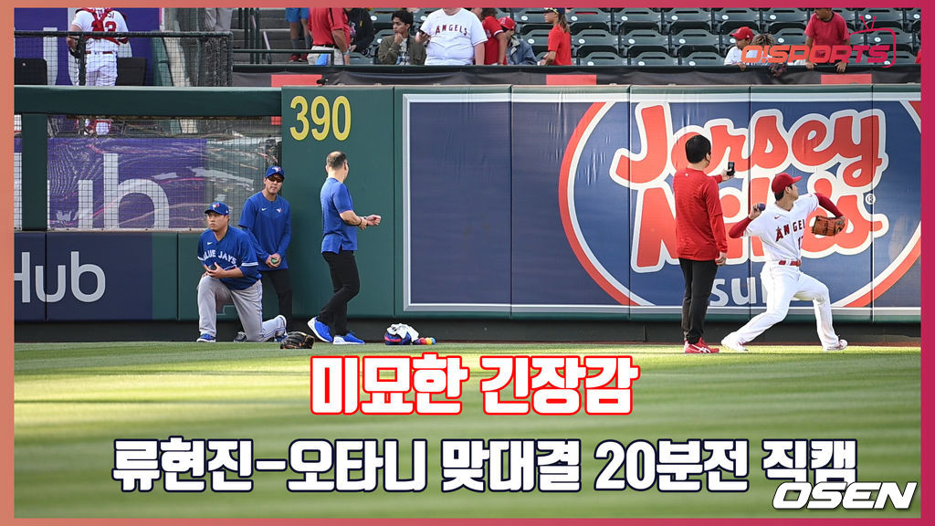양 팀 선발투수가 같은 시간에 외야에서 한 앵글에 담기는 좀처럼 볼 수 없는 이색적인 상황. 투수들 개인마다 가지고 있는 루틴이 있기에 만들어진 미묘한 상황 속 류현진과 오타니는 서로 가벼운 인사를 주고 받은 뒤 몸을 달궜다.