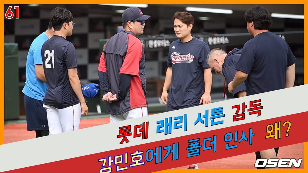 이 모습을 본 롯데 래리 서튼 감독이 강민호에게 다가와 폴더 인사를 했습니다.