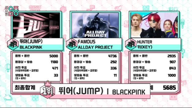 23일 방송된 MBC '쇼! 음악중심'에서는 블랙핑크의 '뛰어(JUMP)'가 8월 넷째주 1위를 차지했다. 이로써 블랙핑크는 '뛰어(JUMP)'를 통해 음악방송 10관왕을 기록하는 기염을 토했다.