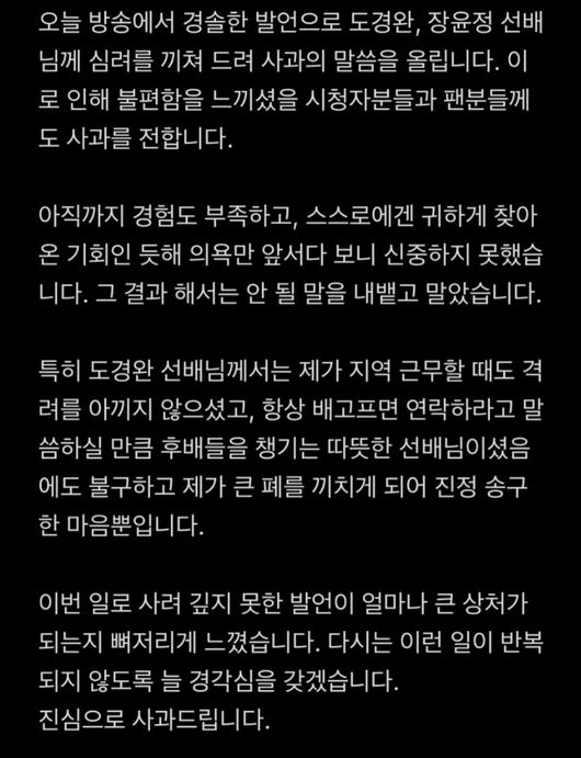 오늘 방송에서 경솔한 발언으로 도경완, 장윤정 선배님께 심려를 끼쳐 드려 사과의 말씀을 올립니다. 이로 인해 불편함을 느끼셨을 시청자분들과 팬분들께도 사과를 전합니다.
