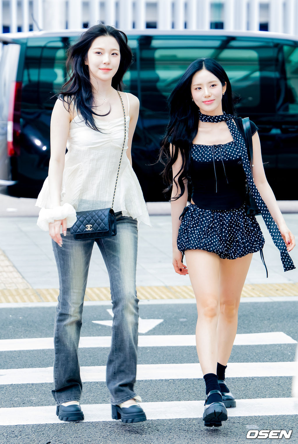 프로미스나인 백지헌과 박지원이 출국장으로 향하며 포즈를 취하고 있다. 2025.08.25 /rumi@osen.co.kr