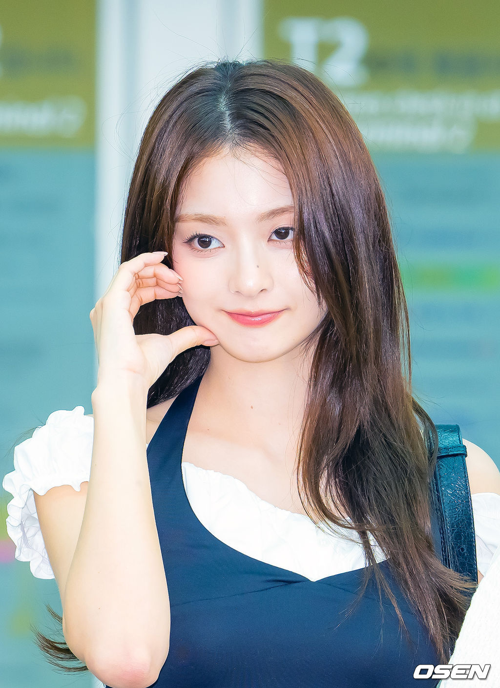 프로미스나인 이나경이 출국장으로 향하며 포즈를 취하고 있다. 2025.08.25 /rumi@osen.co.kr