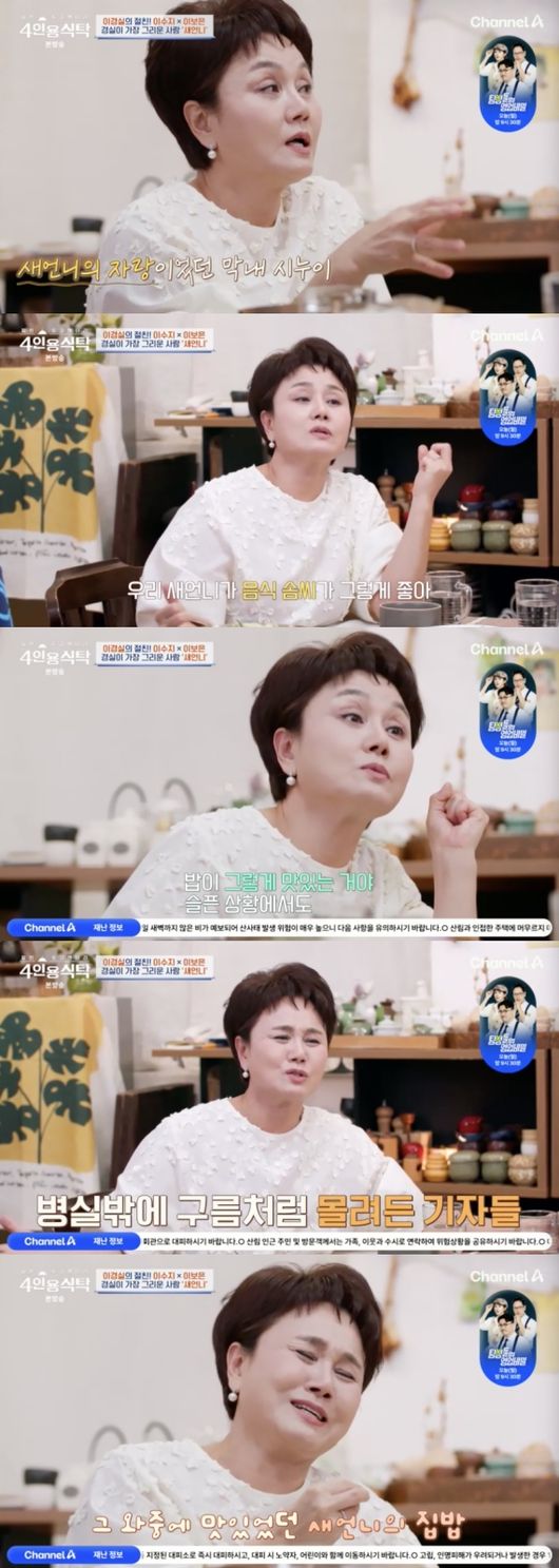 이경실은 지금은 고인이 된 새언니를 향한 고마움과 그리운 마음을 드러냈다. 이경실은 “내가 첫 번째 이혼을 할 때 병원에 입원을 했다. 내가 산소호흡기도 꼽고 있었다. 우리 새언니가 음식 솜씨가 너무 좋다. 병원밥이 맛이 없으니 새언니가 밥을 해왔다. 밥이 그렇게 맛있는 것이다. 그 슬픈 상황에서도"라고 말문을 열었다.