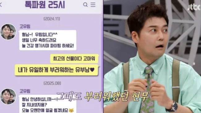 이날 전현무는 “오늘 아침에 (고)우림 씨한테 톡이 왔더라. 지난번에 내 생일 축하 톡을 보내줬을 때 내가 ‘어서 와, 내가 유일하게 부러워하는 유부남’이라고 답했다"고 반가워했다.