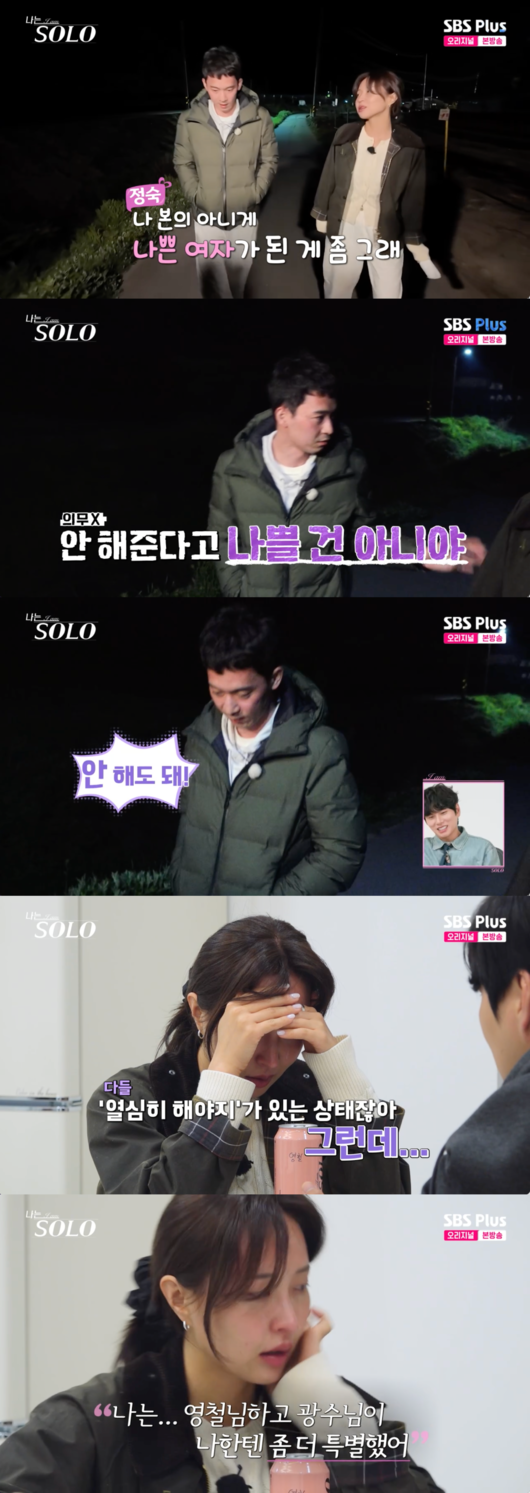 이어 정숙은 영호에게 "나 본의 아니게 나쁜X 된 게 좀 그렇다. 영철님한테는 내가 나쁜X일 수 있는 거지"라며 솔직한 마음을 드러냈다. 이에 영호는 "상황 설명을 해주고 정리를 해줬으면 좋았을 수도 있지만, 그게 의무는 아니다"라며 정숙의 입장을 이해해줬다.