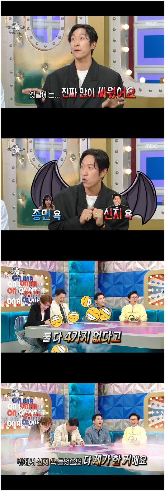 그는 중간책 역할로 “신지한테는 종민이 형 욕을 하고, 종민이 형한테는 신지 욕을 했다”라면서 “그러다가 덜 싸우게 되고 그랬다”라고 말했다. 김구라는 “중간에 본인이 폭발한 적 없냐”라고 물었다. 이에 빽가는 “그럴 때 저는 나갔고, 화장실을 갔다. 술자리에서 멤버들 욕을 했다. 둘 다 싸가지 없다고. 엄청나게 욕하고 다녔습니다. 밖에서 신지 욕을 들으면 그거 다 제가 한 거다”라며 멤버를 위해 자신의 이미지를 소비하는 데 여념이 없었다.