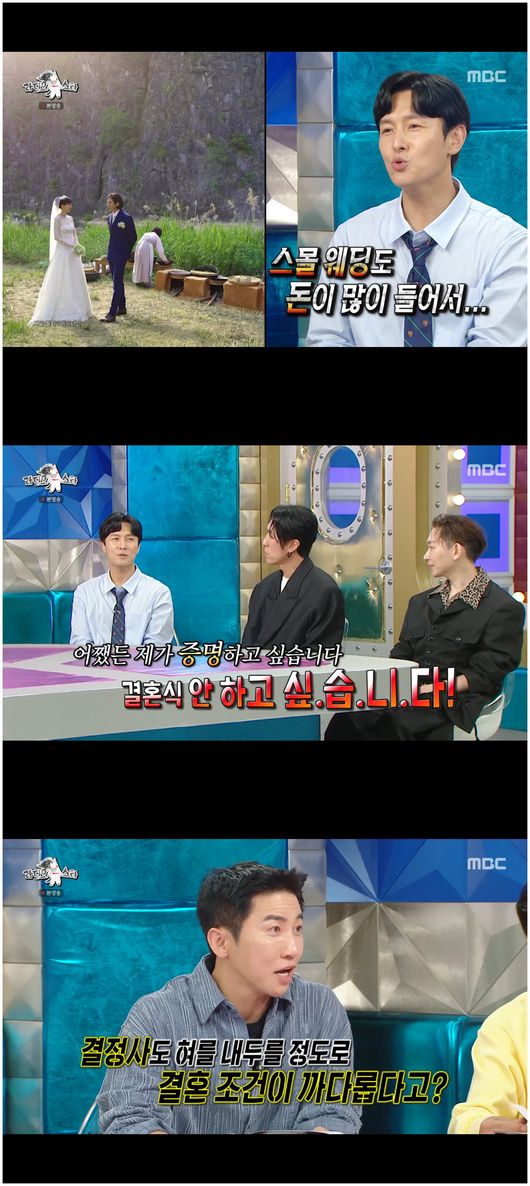 김동완은 “일단 저는 구축 아파트를 선호한다. 1997년 사이에서 2008년 사이에 지어진 아파트여야 한다. 그리고 결혼식을 안 올리고 싶다”라며 자신만의 결혼 조건을 내세웠다. 까다로울 것 같진 않으나, 까다로운 조건이었다. 특히 식을 올리지 않는 건 너무나 생소해 보였다. 김동완은 “결혼식은 너무 사회에서 만들어진 문화가 아닐까, 그냥 그런 돈은 가정이나 사회 환원으로 하는 게 나을 거 같다. 스몰 웨딩도 돈이 많이 든다. 정화수 떠놓고 하고 싶다”라고 말해 김구라를 대노하게 만들었다.