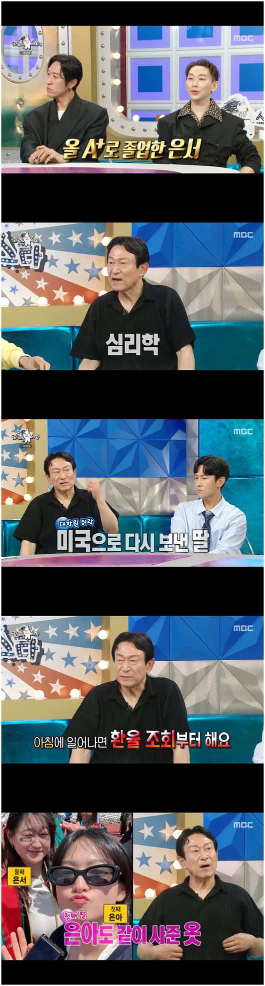 그러나 김구라는 “어휴, 학비 많이 들겠네”라고 말했고, 김응수는 “그래서 아침에 일어나면 매일 환율 조회부터 한다”라고 말해 웃음을 안겼다.