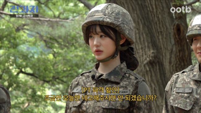 이처럼 긍정 마인드를 뽐내던 장원영은 본격적인 유격 훈련에 돌입하자, 점차 생기를 잃어가 보는 이들에게 웃음을 안긴다. 실제 군부대에 입성해 군사학과 학생들과 함께 지옥의 PT 체조부터 산길 구보, 유격 기구 훈련까지 소화한 장원영은 급기야 교관과 PT 체조 개수를 두고 ‘네고’를 시도한다.