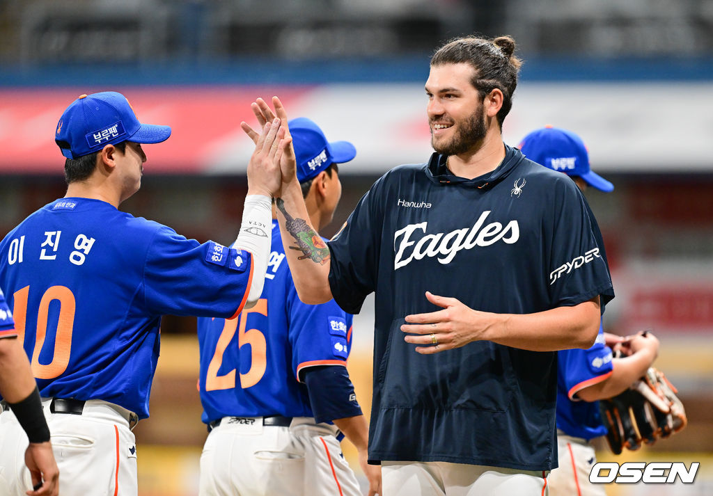 경기종료 후 승리투수가 된 한화 폰세가 동료들의 축하를 받고 있다 2025.08.28 / soul1014@osen.co.kr