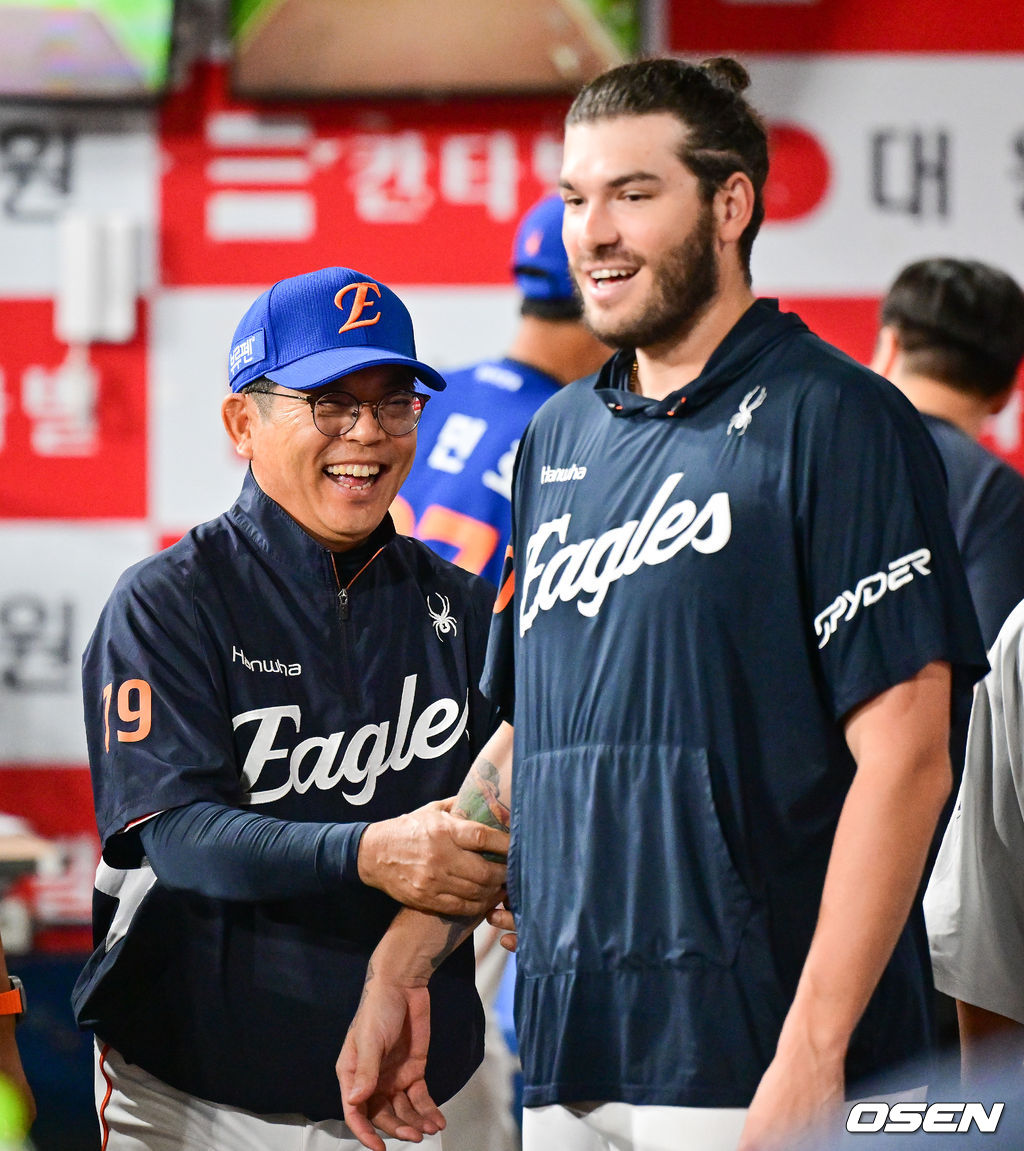 경기종료 후 한화 양상문 코치가 승리투수가 된 폰세를 붙잡고 미소 짓고 있다. 2025.08.28 / soul1014@osen.co.kr