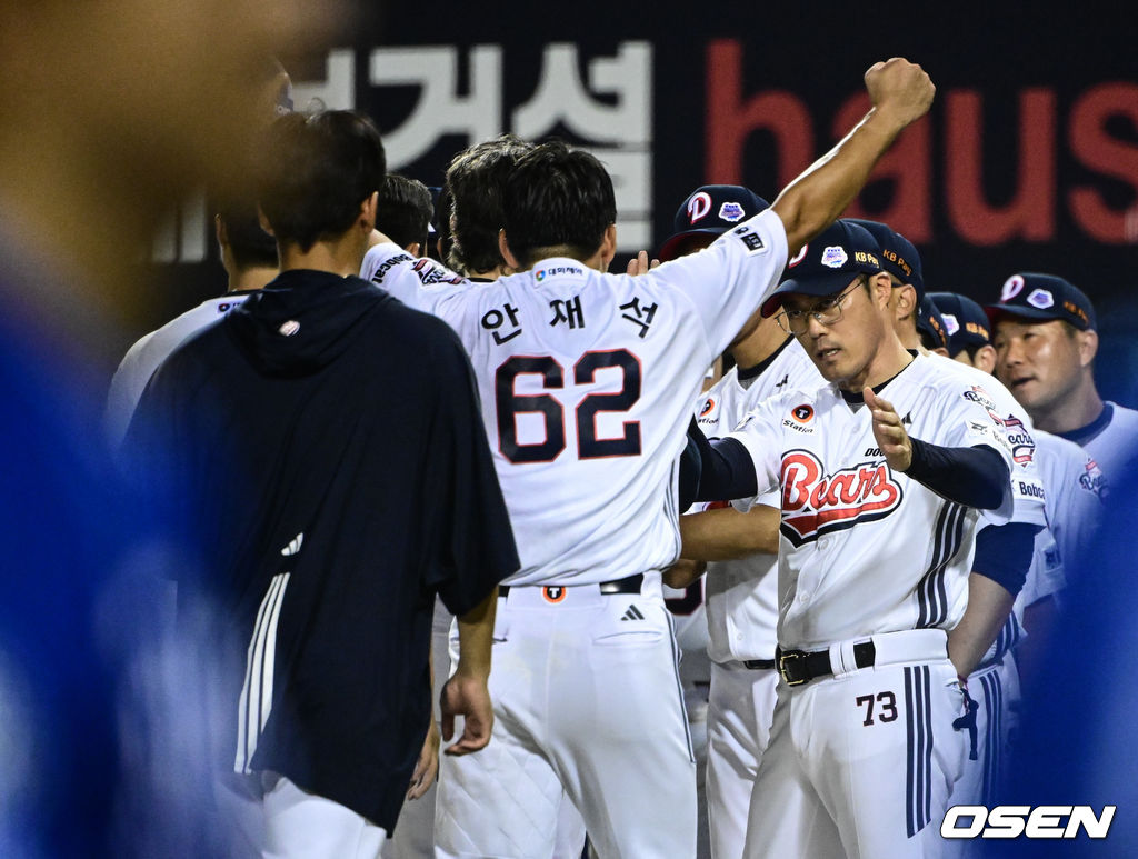 두산 조성환 감독대행이 연장 10회말 1,2루에서 끝내기 안타를 날린 안재석과 승리를 기뻐하고 있다. 2025.08.28 /cej@osen.co.kr