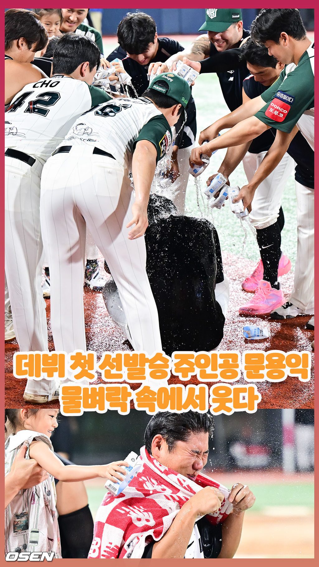 경기종료 후 데뷔 첫 선발승 거둔 문용익의 축하 물세례를 숏폼을 담았다. 2025.08.31 / soul1014@osen.co.kr