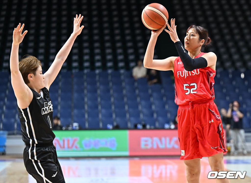후지쯔(일본) 미야자와 유키가 용인 삼성생명 하마니시 나나미의 마크를 피해 3점슛을 시도하고 있다. 2025.09.01 / foto0307@osen.co.kr