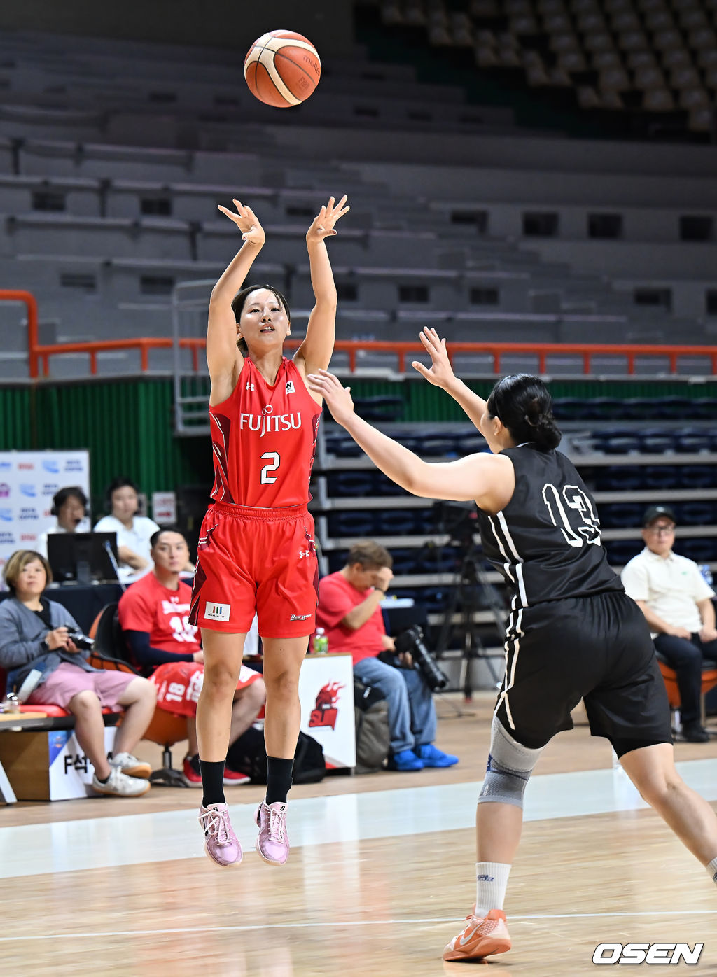 후지쯔(일본) 하야시 마호가 용인 삼성생명 김단비의 마크를 피해 3점슛을 시도하고 있다. 2025.09.01 / foto0307@osen.co.kr