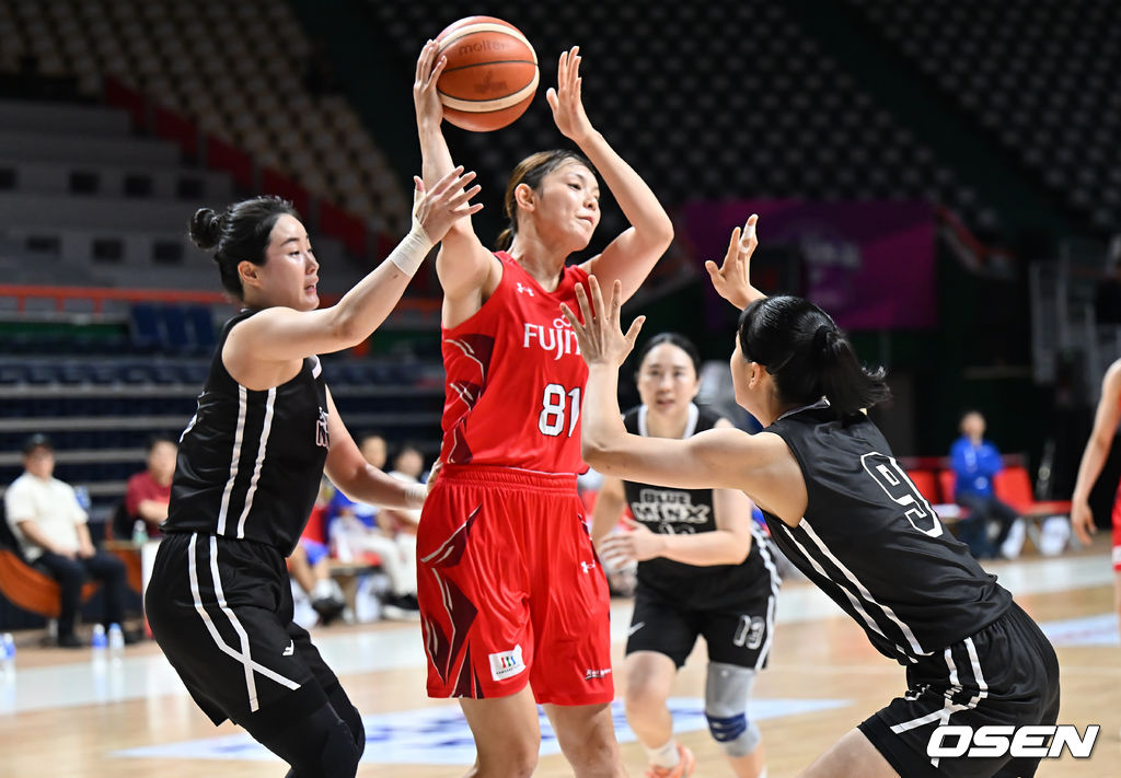 후지쯔(일본) 미야시타 키호가 용인 삼성생명 유하은, 김아름의 마크를 피해 패스하고 있다. 2025.09.01 / foto0307@osen.co.kr