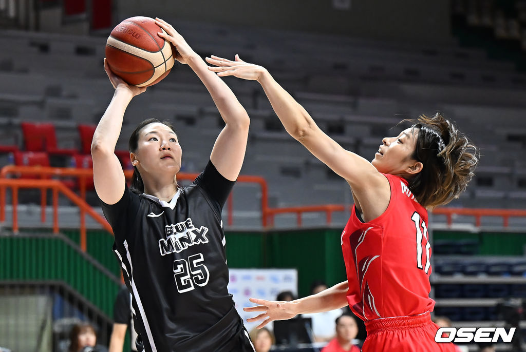 용인 삼성생명 배혜윤이 후지쯔(일본) 미에자와 미오의 마크를 피해 골밑슛을 시도하고 있다. 2025.09.01 / foto0307@osen.co.kr