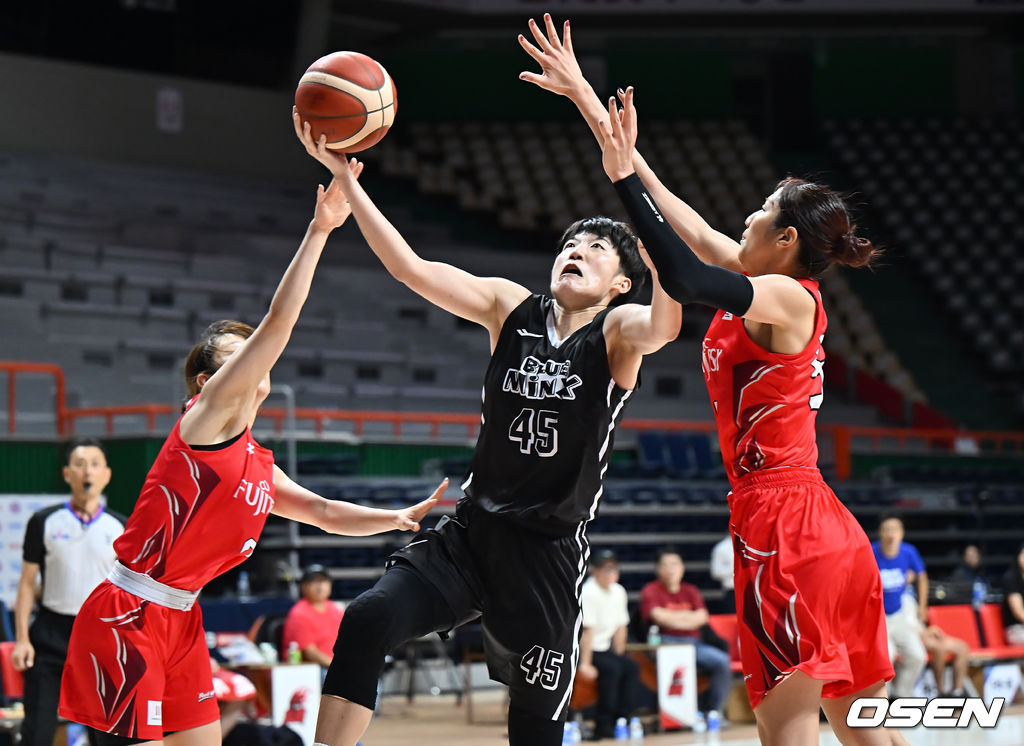 용인 삼성생명 가와무라 미유키가 야마다 아오이와 미야자와 유키의 마크를 피해 골밑슛을 시도하고 있다. 2025.09.01 / foto0307@osen.co.kr