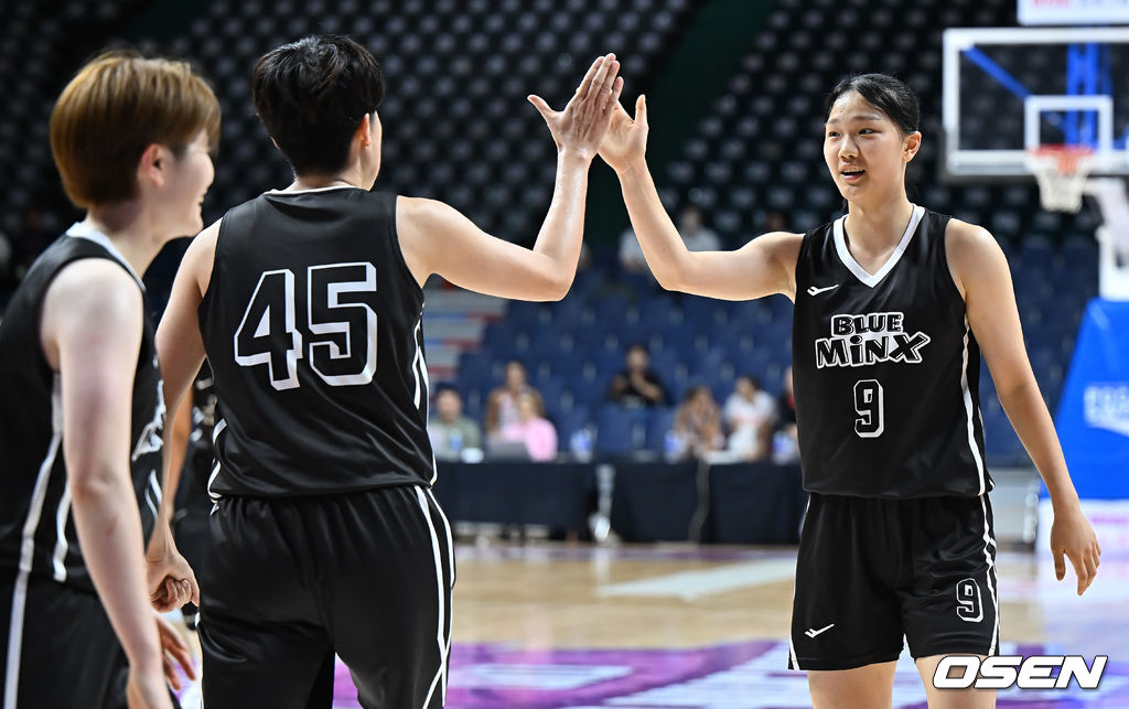 용인 삼성생명 유하은이 골밑슛을 성공시킨 가와무라 미유키를 축하하고 있다. 2025.09.01 / foto0307@osen.co.kr