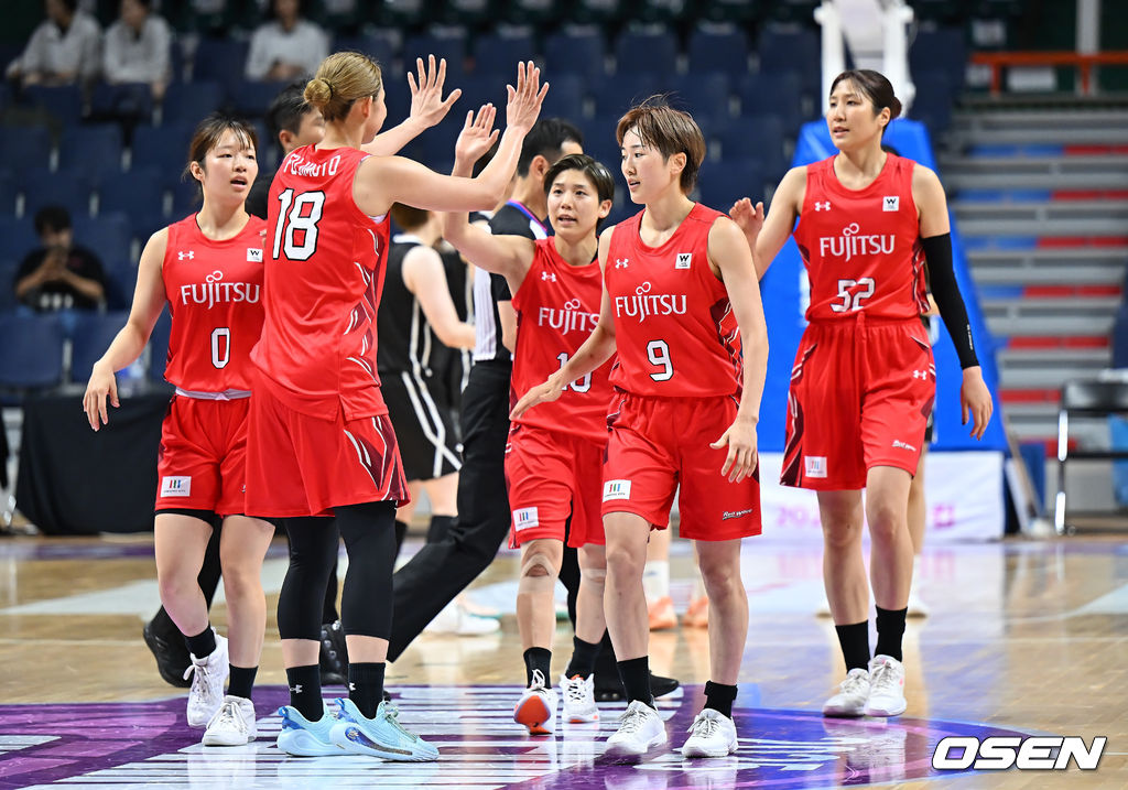 후지쯔(일본) 선수들이 용인 삼성생명에 68-57로 승리, 기쁨을 나누고 있다. 2025.09.01 / foto0307@osen.co.kr