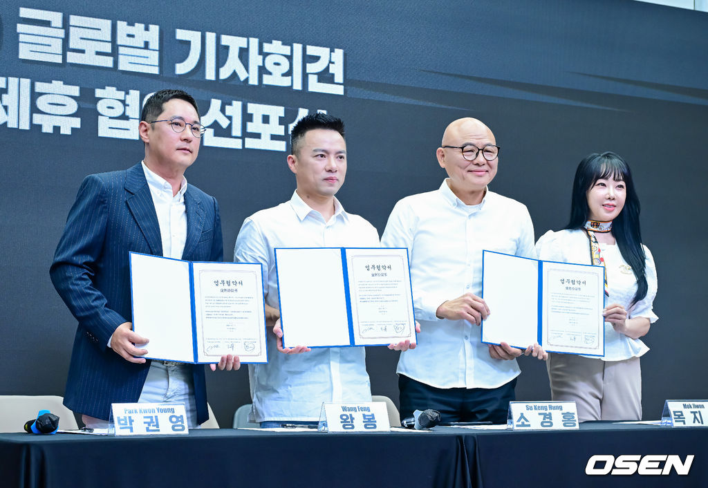 피나클엔터테인먼트 박권영 대표, 럭키도어 왕봉, 소경홍 대표, 럭키게이트코리아 목지원 대표가 전략적 제휴 협약 선포식을 하고 있다. 2025.09.01 / jpnews@osen.co.kr
