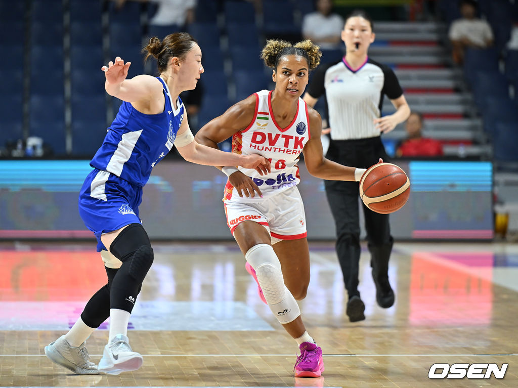 DVTK 훈테름(헝가리) 어호 니너가 인천 신한은행 김진영의 마크를 피해 골밑돌파를 시도하고 있다. 2025.09.01 / foto0307@osen.co.kr