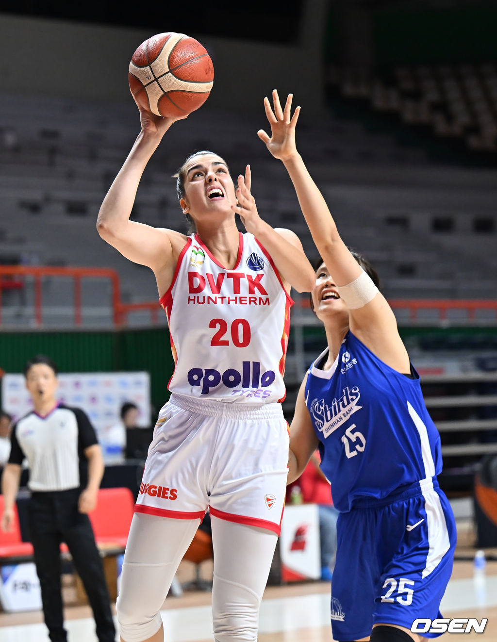 DVTK 훈테름(헝가리) 파울로 긴조 아란테스가 인천 신한은행 미마 루이의 마크를 피해 골밑슛을 시도하고 있다. 2025.09.01 / foto0307@osen.co.kr