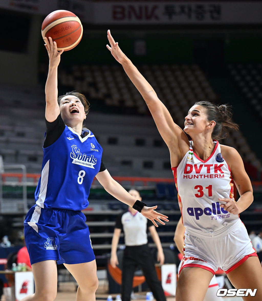 인천 신한은행 김지영이 DVTK 훈테름(헝가리) 벨라 스무다의 마크를 피해 골밑슛을 시도하고 있다. 2025.09.01 / foto0307@osen.co.kr