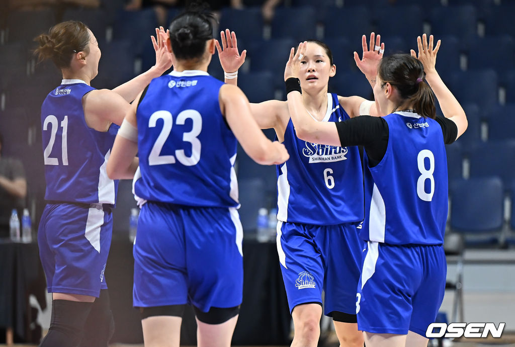 인천 신한은행 선수들이 리드폭을 많이 늘리고 하이파이브를 하고 있다. 2025.09.01 / foto0307@osen.co.kr