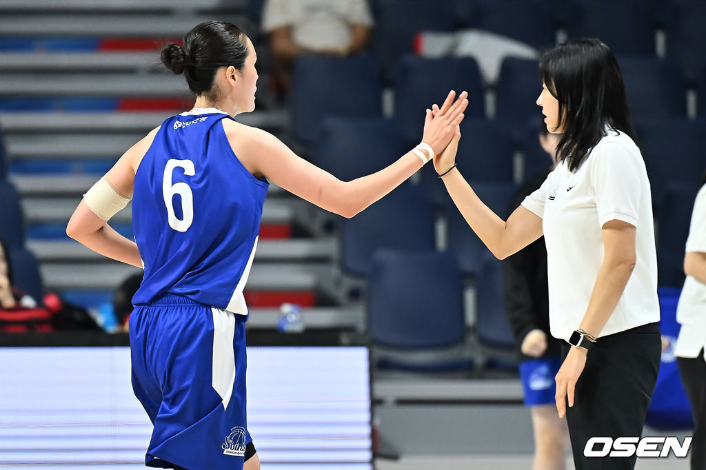 인천 신한은행 최이샘이 최윤아 감독과 하이파이브를 하고 있다. 2025.09.01 / foto0307@osen.co.kr