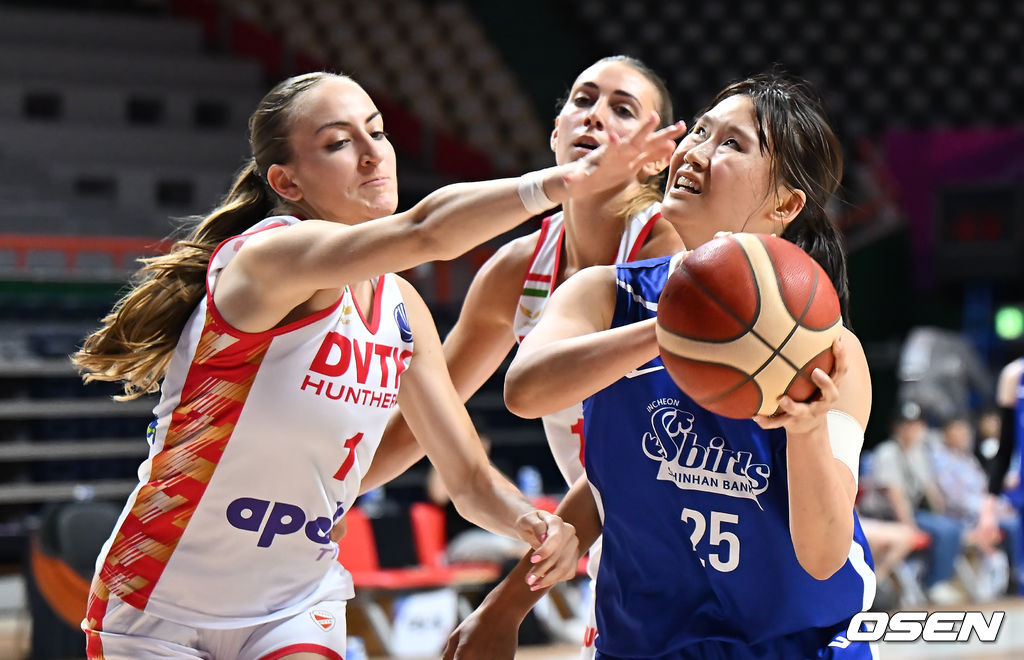 인천 신한은행 미마 루이가 DVTK 훈테름(헝가리) 미클로슈 멜린더의 마크를 피해 골밑슛을 시도하고 있다. 2025.09.01 / foto0307@osen.co.kr