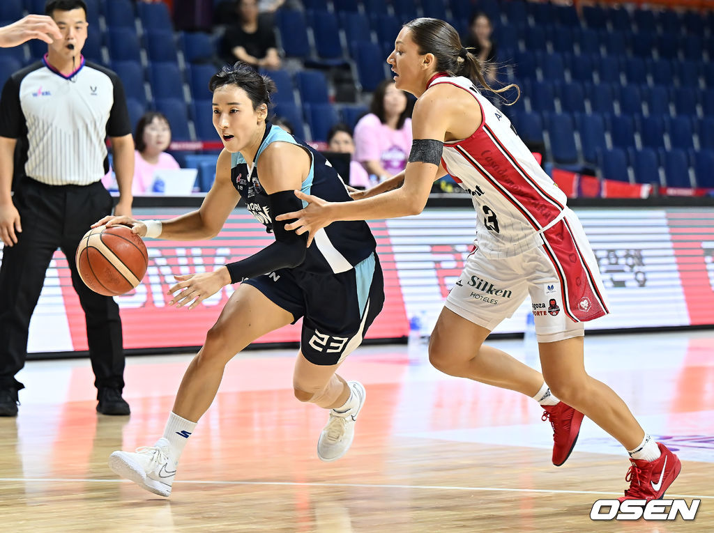 아산 우리은행 김단비가 카사데몬트 사라고사(스페인) 엘레나 푸에오의 마크를 피해 공격하고 있다. 2025.09.01 / foto0307@osen.co.kr