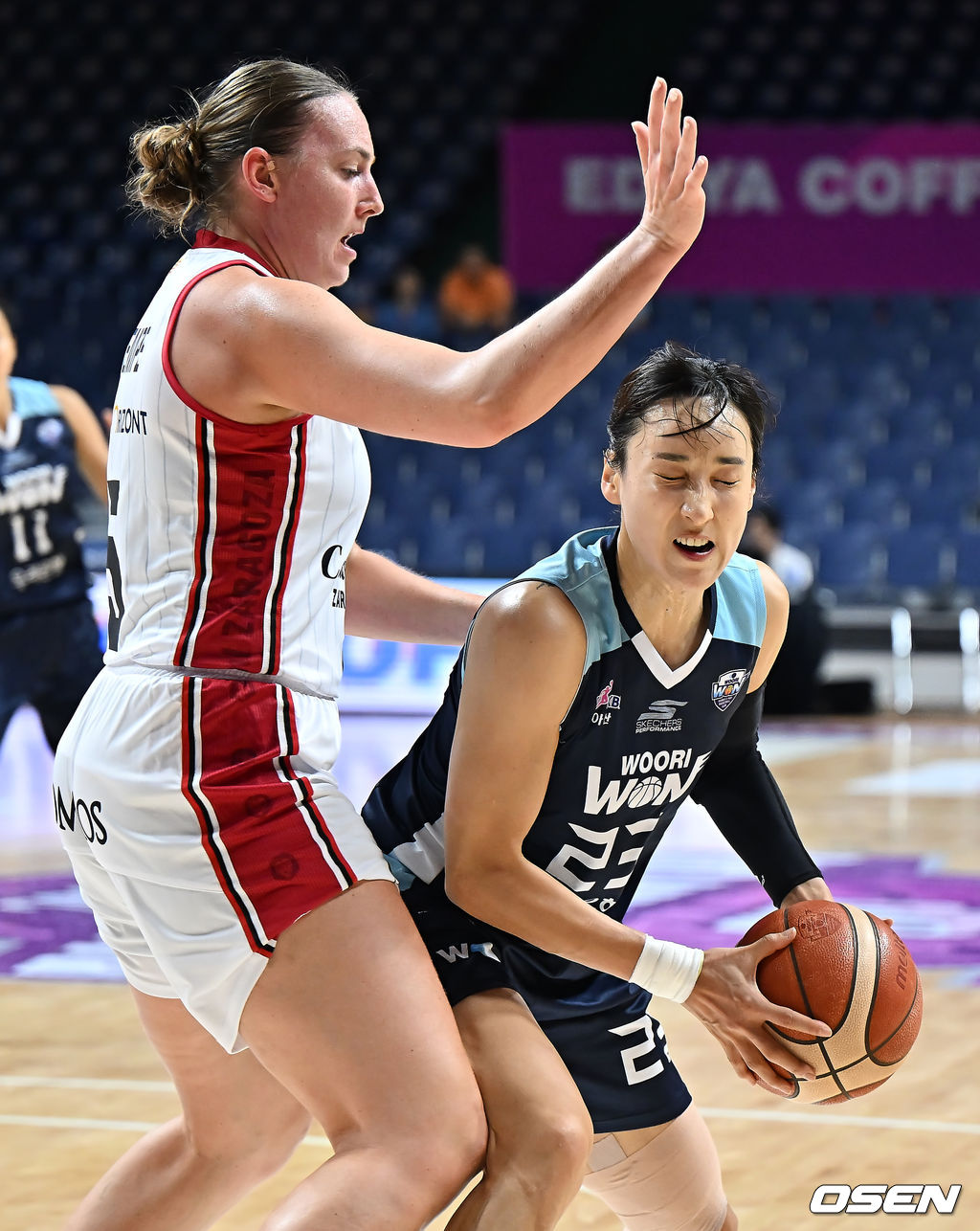 아산 우리은행 김단비가 카사데몬트 사라고사(스페인) 메리트 라모나 헴페의 수비에 막히고 있다. 2025.09.01 / foto0307@osen.co.kr