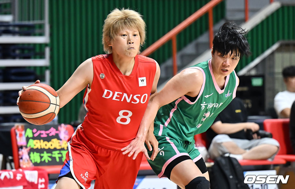 덴소 아이리스(일본) 다카다 마키가 부천 하나은행 진안의 마크를 피해 골밑돌파를 시도하고 있다. 2025.09.02 / foto0307@osen.co.kr