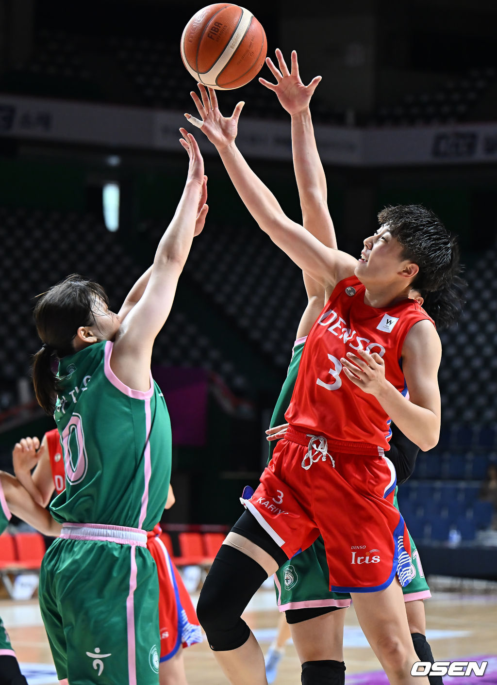 덴소 아이리스(일본) 히라카 마호가 부천 하나은행 하지윤의 마크를 피해 골밑슛을 시도하고 있다. 2025.09.02 / foto0307@osen.co.kr