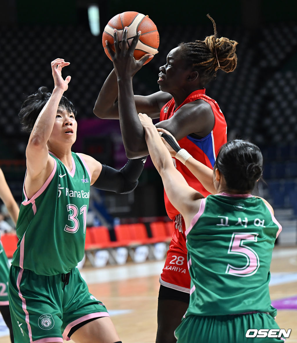 덴소 아이리스(일본) 실라 소크나 파투 디아가 부천 하나은행 진안, 고서연의 마크를 피해 골밑슛을 시도하고 있다. 2025.09.02 / foto0307@osen.co.kr
