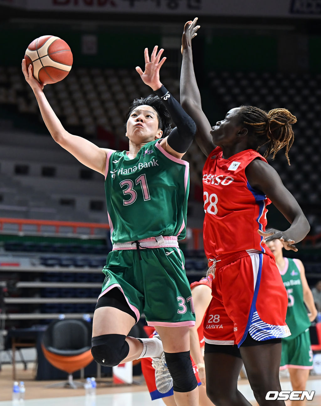 부천 하나은행 진안이 덴소 아이리스(일본) 실라 소크나 파투 디아의 마크를 피해 골밑슛을 시도하고 있다. 2025.09.02 / foto0307@osen.co.kr