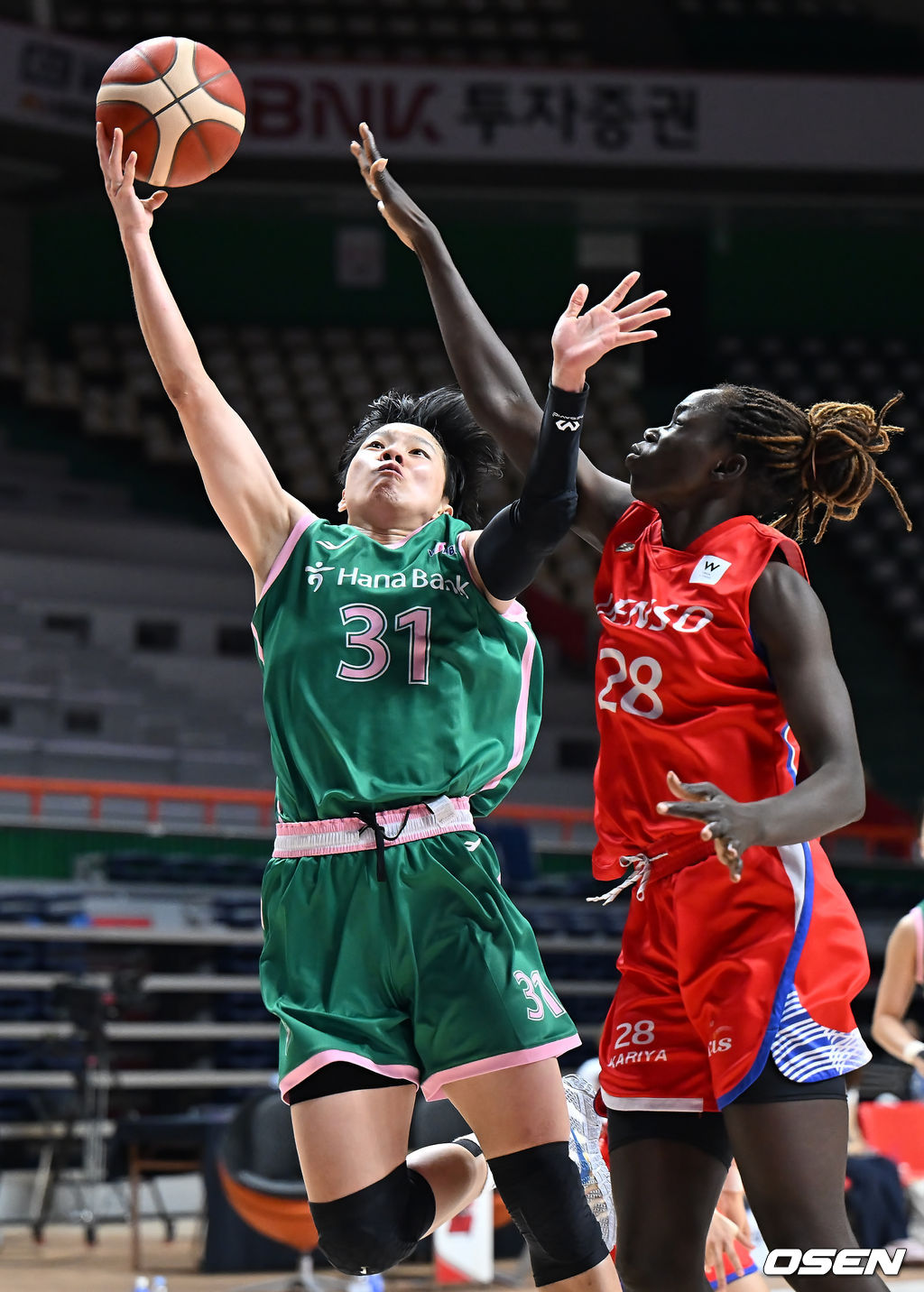 부천 하나은행 진안이 덴소 아이리스(일본) 실라 소크나 파투 디아의 마크를 피해 골밑슛을 시도하고 있다. 2025.09.02 / foto0307@osen.co.kr