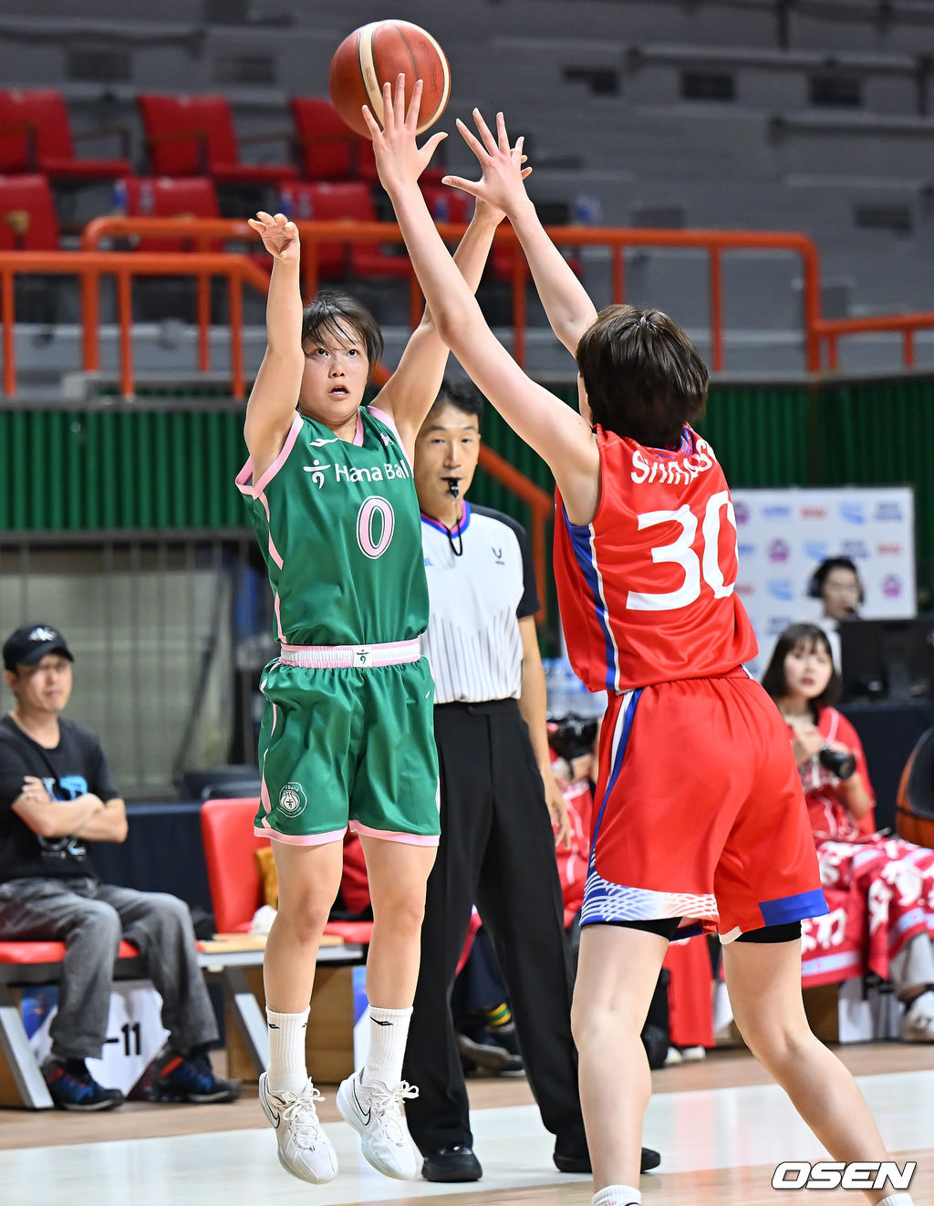 부천 하나은행 하지윤이 덴소 아이리스(일본) 시라이시 미오의 마크를 피해 3점슛을 시도하고 있다. 2025.09.02 / foto0307@osen.co.kr