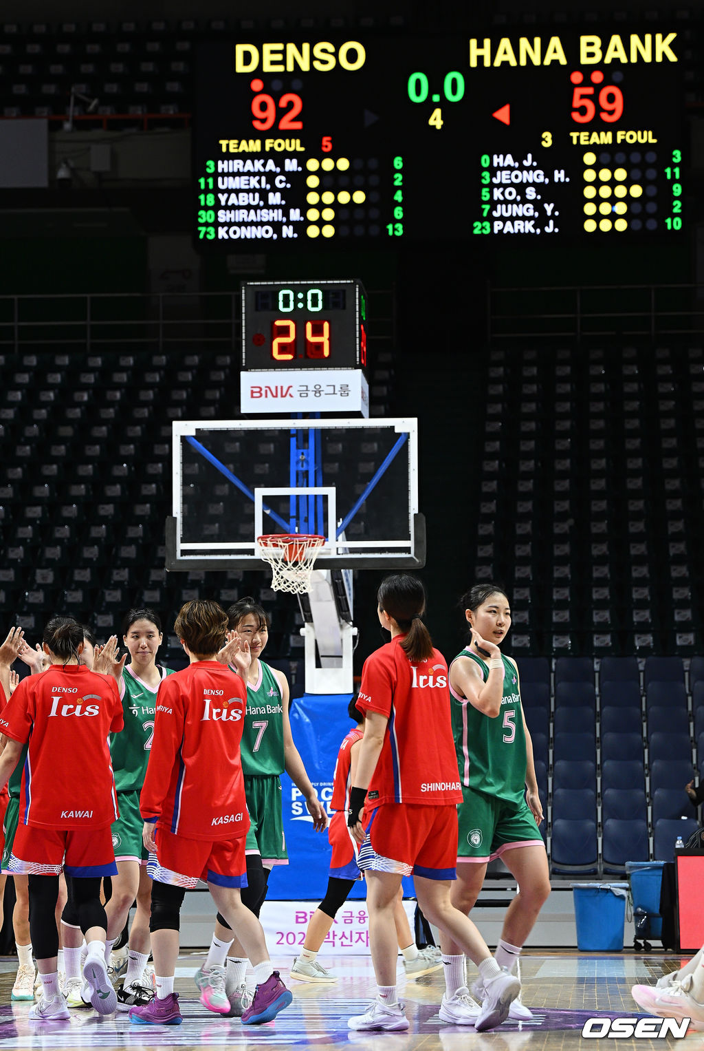 부천 하나은행이 59-92로 패한 후 덴소 아이리스(일본) 선수들과 인사를 하고 있다. 2025.09.02 / foto0307@osen.co.kr