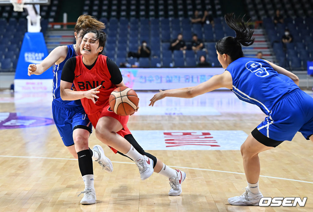 부산 BNK 썸 심수현이 용인 삼성생명 유하은의 마크를 피해 골밑돌파를 시도하고 있다. 2025.09.02 / foto0307@osen.co.kr