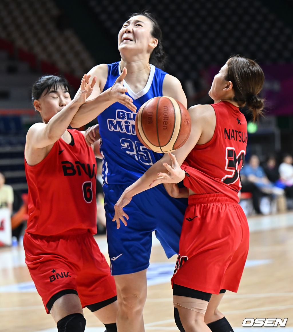 용인 삼성생명 배혜윤이 부산 BNK 썸 이소희, 스나가와 나츠카의 마크에 볼을 놓치고 있다. 2025.09.02 / foto0307@osen.co.kr