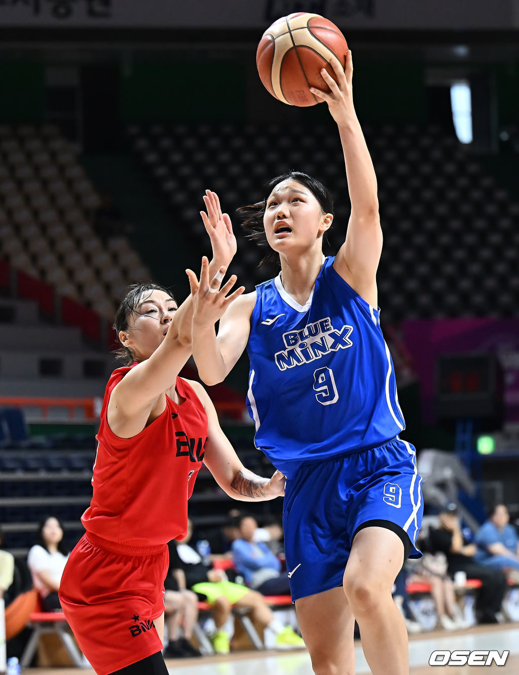 용인 삼성생명 유하은이 부산 BNK 썸 김소니아의 마크를 피해 골밑슛을 시도하고 있다. 2025.09.02 / foto0307@osen.co.kr