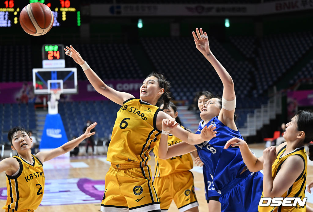 청주 KB스타즈 이윤미와 인천 신한은행 최이샘이 치열한 몸싸움을 하고 있다. 2025.09.02 / foto0307@osen.co.kr