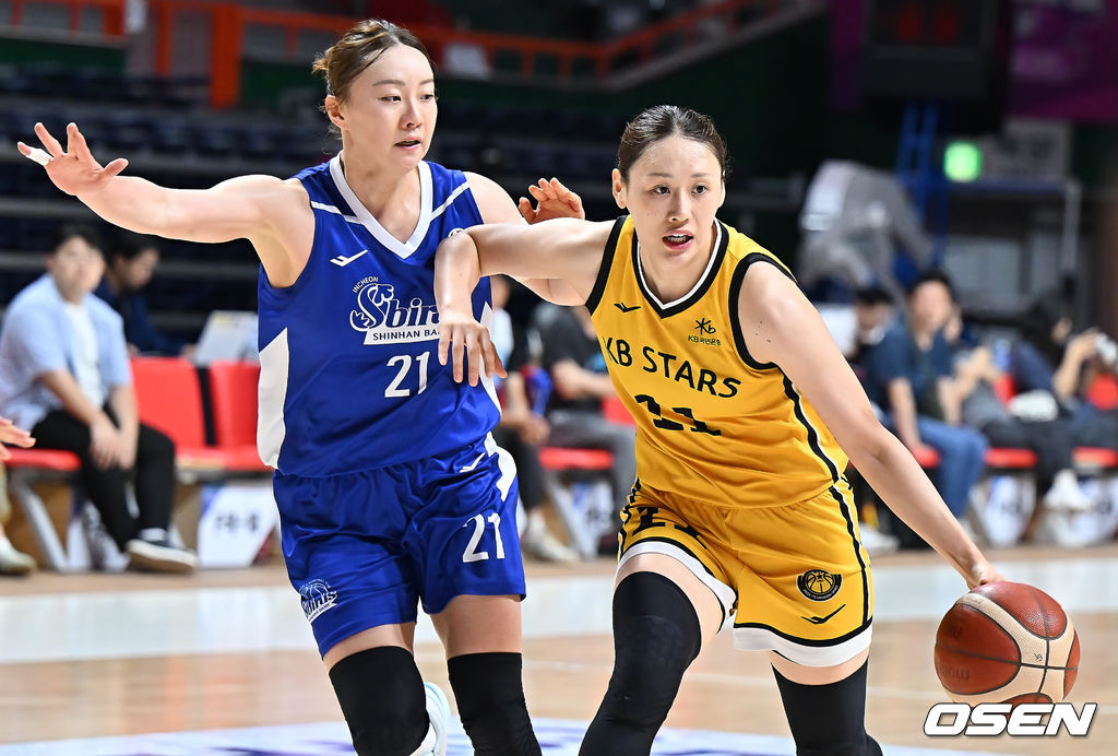 청주 KB스타즈 강이슬이 인천 신한은행 김진영의 마크를 피해 골밑돌파를 시도하고 있다. 2025.09.02 / foto0307@osen.co.kr