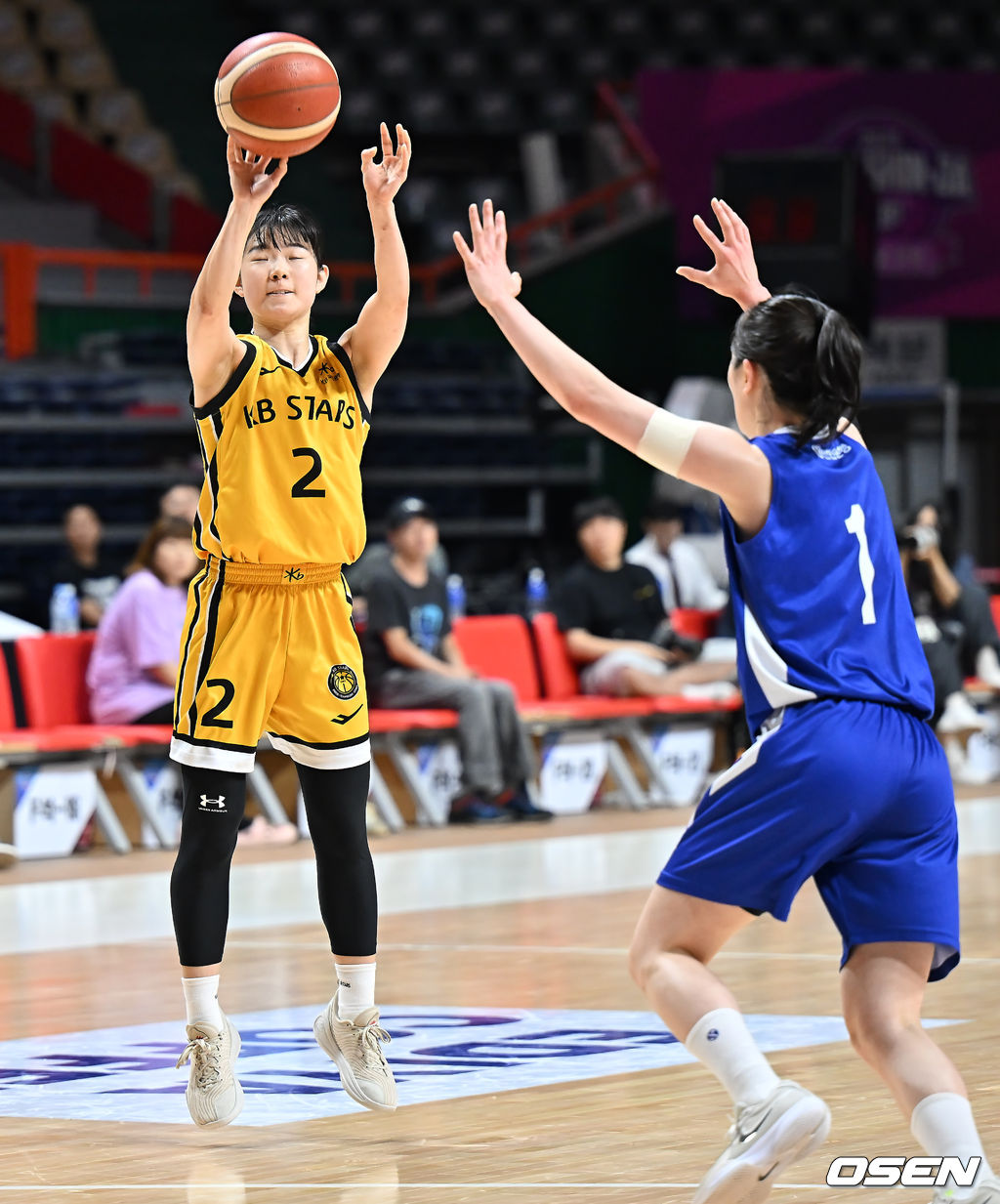청주 KB스타즈 허예은이 인천 신한은행 신이슬의 마크를 피해 3점슛을 시도하고 있다. 2025.09.02 / foto0307@osen.co.kr